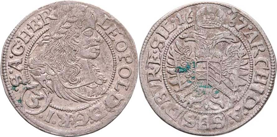 3 Krejcar 1667 SHS, Vratislav-Hammerschmidt, dělení opisů: "...R.I.(3).S.A.../...A.(SHS).D.BVR.ET.SIL.", MKČ.1619, Nech.737, 1.585g, skvrnky, patina
