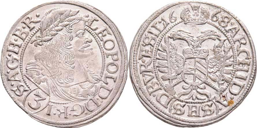 3 Krejcar 1668 SHS, Vratislav-Hammerschmidt, dělení opisů: "...R.I.(3) S.A.../...A.(SHS).D.BVR.ET.SIL.", MKČ.1619, Nech.738, 1.784g, téměř