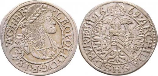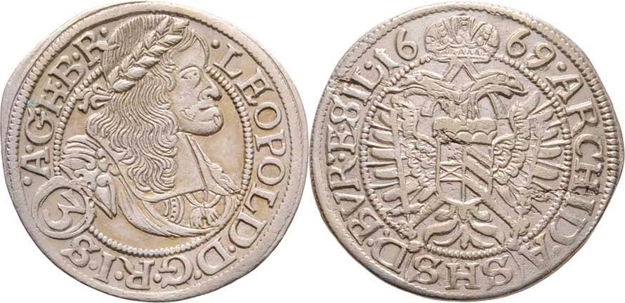 3 Krejcar 1669 SHS, Vratislav-Hammerschmidt, dělení opisů: "...I.S.(3).A.G.../...A.(SHS).D:BVR:ET.SIL.", MKČ.1621, Nech.739, 1.755g, nep.vady materiálu, pat.