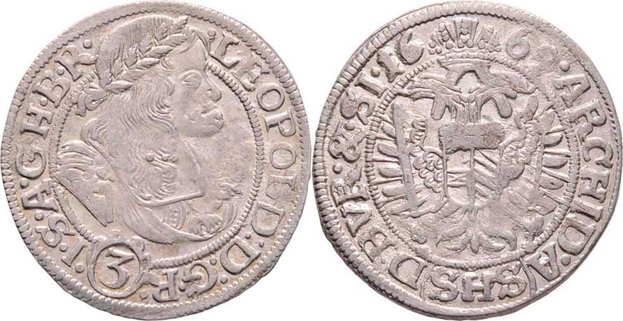 3 Krejcar 1669 SHS, Vratislav-Hammerschmidt, dělení opisů: "...G.R.(3).I.S.../...A (SHS) D.BVR.&.SI." MKČ.1622, Nech.739, 1.781g, nep.nedor., pěkná patina
