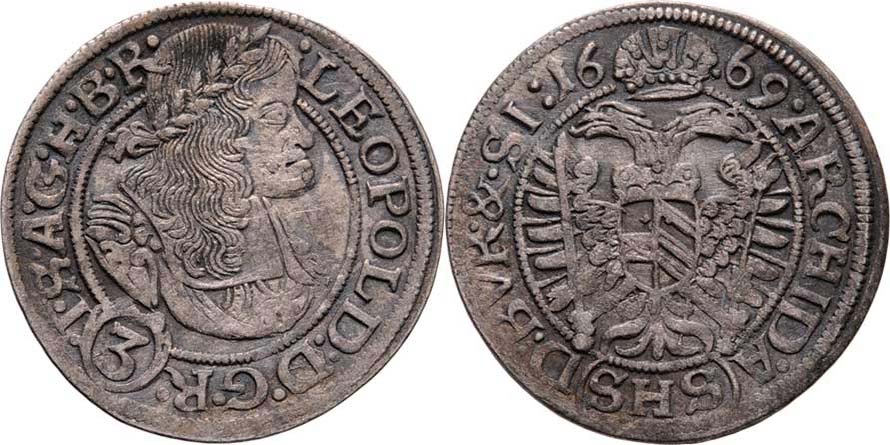 3 Krejcar 1669 SHS, Vratislav-Hammerschmidt, dělení opisů: "...G.R.(3).I.S.../...A.(SHS).D:BVR.&.SI:", MKČ.1624, Nech.739, 1.589g, nep.ned., pěkná patina