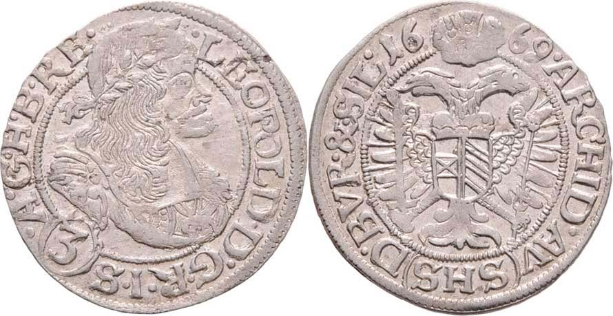 3 Krejcar 1669 SHS, Vratislav-Hammerschmidt, dělení opisů: "..I.S.(3).A.G.H.B.RE./.AV.(SHS).D.BVR.&.SIL", MKČ.1624, Nech.739, 1.429g, nep.ned., patina, tém. R!