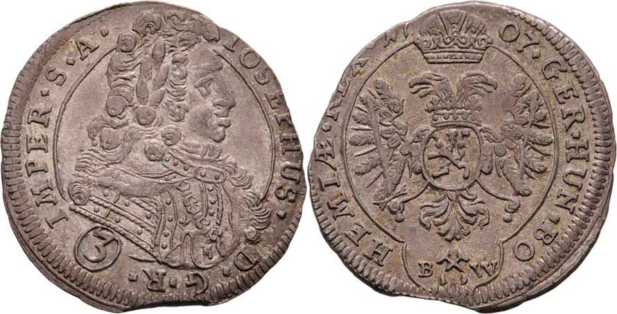 3 Krejcar 1707, K.Hora-Wohnsiedler, J.3b, MKČ.1731, 1.704g, krajový střížek, nep.exc., pěkná patina