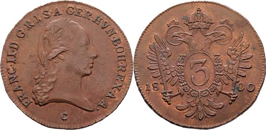 Cu 3 Krejcar 1800 C, Praha, 8.373g, pěkná patina