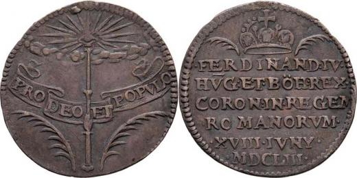 Střední jeton na korunovaci v Regensburgu 18.VI.1653 - Boží oko, žezlo, ratolesti a nápis/ koruna a nápis, Ag 24mm, 2.208g, M.845, Nov.D.8b, nep.stopa, pat. RR!