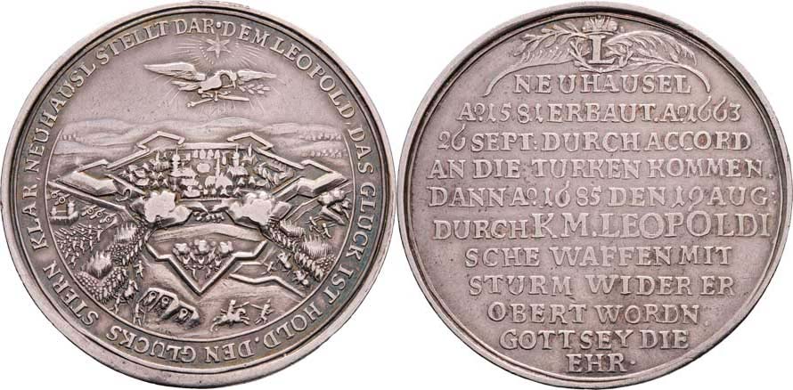 Nesign. - osvobození Nových Zámků od Turků 1685 - pohled na opevněné město, orel, opis / monogram, 11-řádk.nápis, Ag 43mm, 29.528g, M.952, H.2094, pat.