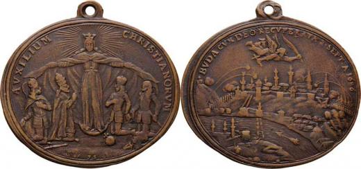 P.Seel - osvobození Budína od Turků 1686 - Madona a 4 klečící panovníci, opis / anděl nad obleženou Budou a nápis, Sign., AE 45/38 mm, 9.826g, M.1021, H.2126
