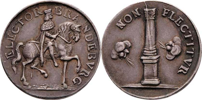 Medailka na korunovaci v Augsburgu b.l. (1690) - branibor.kurfiřt na koni zprava, opis / sloup, větry, opis, Ag 17mm, 2.304g, Nov.L.78a, M.1255, vada raz.