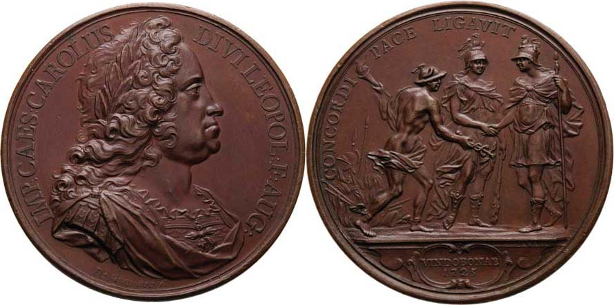 Gennaro - na Vídeňský mír s Francií 7.V.1725 - poprsí zprava, opis / Merkur a dva vojevůdci, písmo, Sign., měď 55mm, 62.689g, M.1595, nep.hr., nep.rys., patina