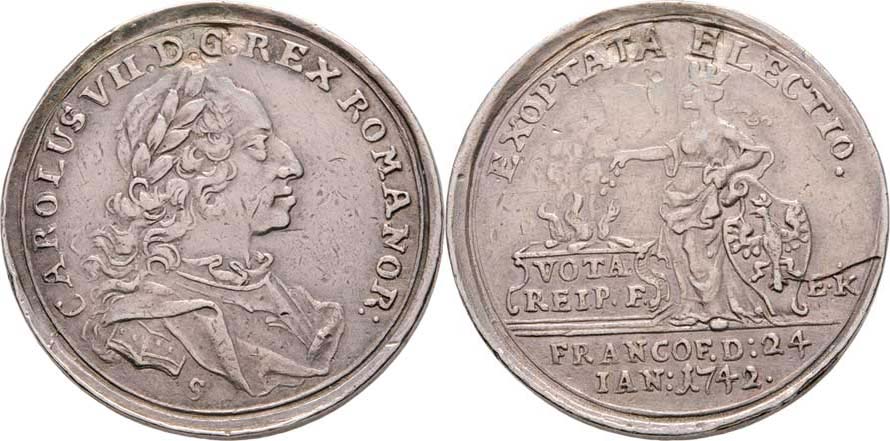 Větší jeton na volbu cís. ve Frankfurtu 24.1.1742 - poprsí zprava, opis / Germanie u oltáře, opis a nápis, Ag 26mm, 6.777g, Nov.B.28b, För.237, patina