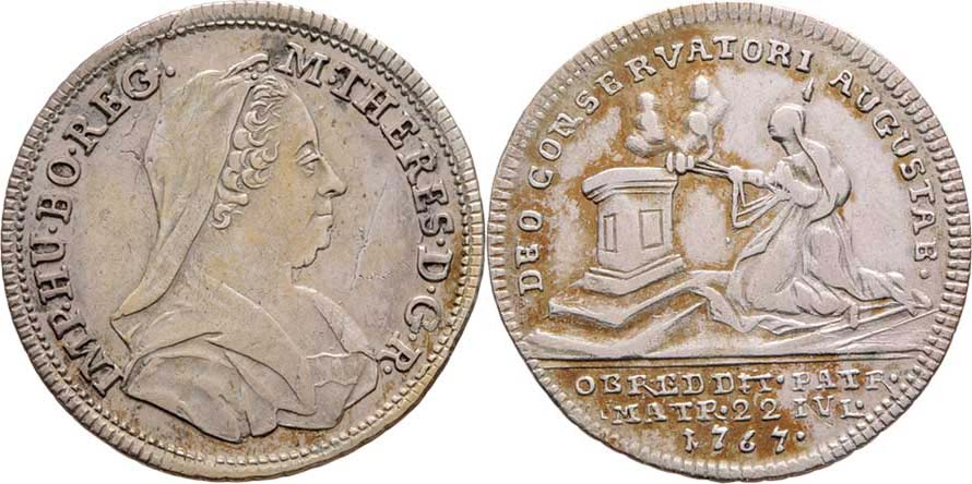 Widemann - menší jeton na uzdravení od neštovic 1767 - portrét, opis/ císařovna klečící před oltářem, opis a nápis, Ag 21mm, 1.774g, ČS.1368, M.1979, patina