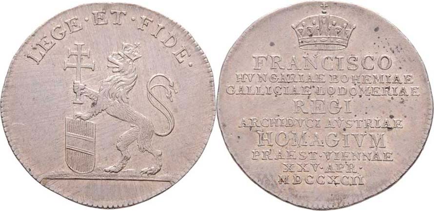 Menší jeton na holdování ve Vídni 25.4.1792 - stojící lev se znakem a křížem, opis / koruna a 9-řádk.nápis, Ag 20mm, 2.200g, Nov.B.3b, M.2259, nep.rysky, patina