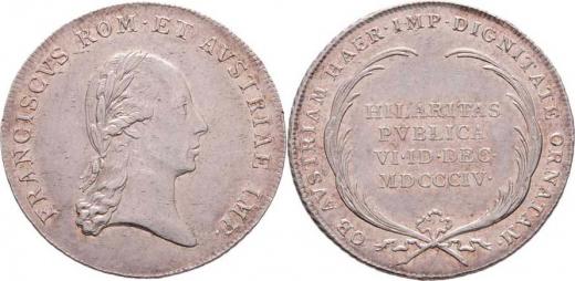 Větší jeton na vyhl. Rakouského císařství 6.12.1804 - portrét zprava, opis / 4-řádk. nápis ve věnci a opis, Ag 25mm, 4.361g, ČS.1482, Nov.O.1b, nep.rysky, patina