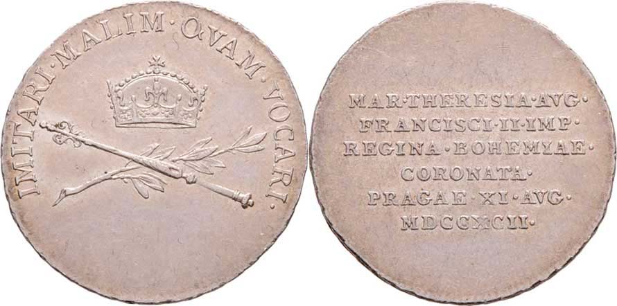 Menší jeton na korunovaci v Praze 11.8.1792 - koruna, žezlo, vavřínová snítka a opis / šestiřádkový nápis, Ag 20mm, 2.191g, Nov.T.3b, ČS.1442, H.3342, nep.rysky