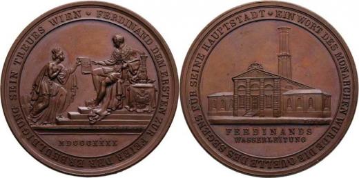 Roth - dokončení Ferdinandovy vodárny ve Vídni 1840 - Vindobona předává plány císaři, opis/ vodárna, písmo, Sign., měď 51mm, M.2593, nep.hr., dr.rys., pat., tém.