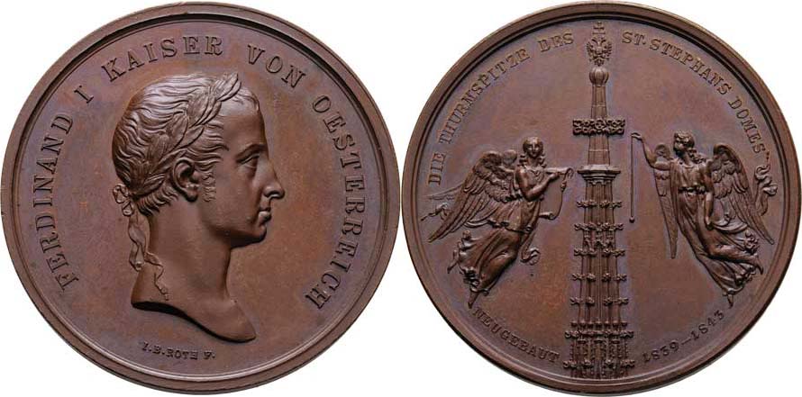 Roth - dokončení věže chrámu sv.Štěpána ve Vídni 1843 - poprsí zprava, opis/ vrchol věže mezi dvěma anděly, opis, Sign., měď 47mm, 48.575g, M.2605(AR), Haus.91