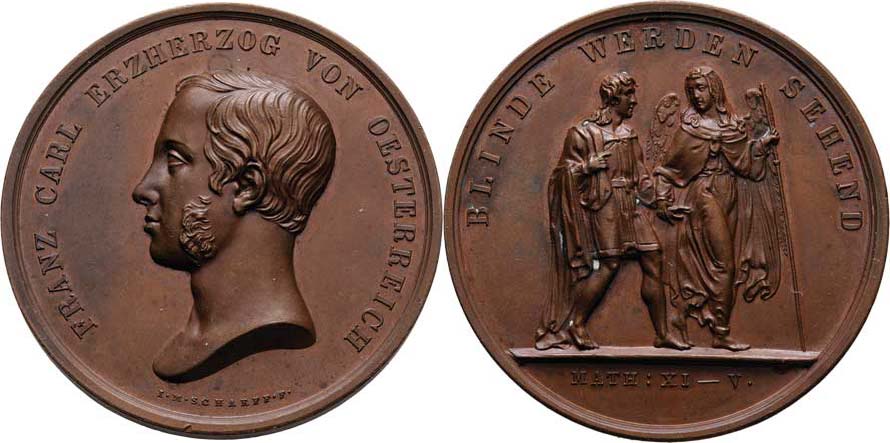 I.M.Scharff - pamětní medaile slepeckého ústavu b.l. - poprsí zleva, opis / Tobiáš vedený andělem, písmo, Sign., měď 45mm, H.3707(Ag), nep.hr., krásná patina