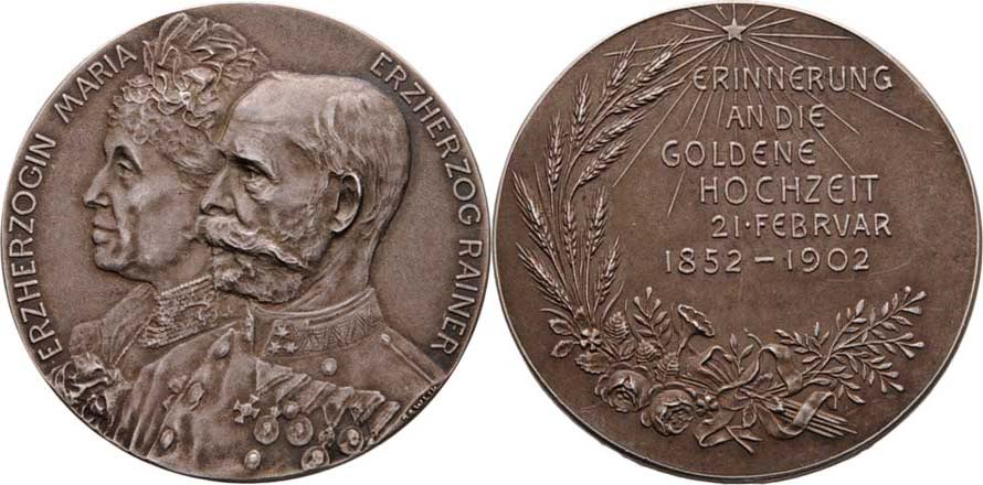 Pavlik - AR medailka na zlatou svatbu 21.2.1902 - dvojportrét zleva, opis/ nápis, věnec z obilí a růží, zářící hvězda, Sign., Punc., 25mm, 6.194g, patina