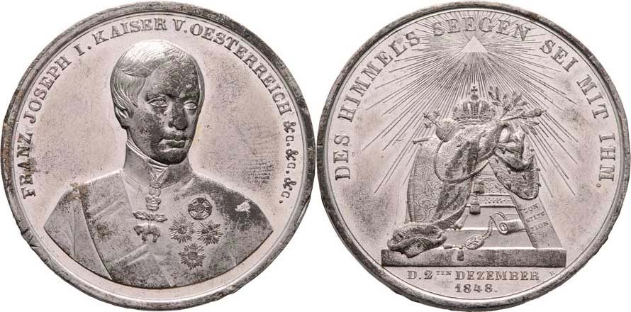 Rabausch - nástup. medaile 2.12.1848 - poprsí zpředu, opis / Boží oko, korunovační insignie na oltáři, opis, Sign.R, cín 41mm, Nov.3c, hr., rysky, pův.etue