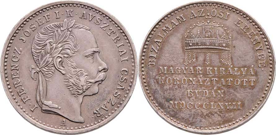 Menší maďarský peníz na korunovaci v Budíně 8.6.1867 - poprsí zprava, opis / koruna, opis a 4-řádk. nápis, Ag 20mm, 3.275g, M.2710, H.3795, P.23, Nov.B.6b, pat.