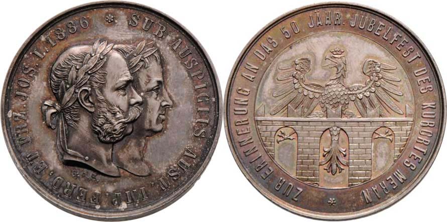 Sign.GAS - AR medaile na 50 let lázní Merano 1886 - poprsí Ferdinanda V. a Fr.Josefa I. zprava, opis / znak města, něm.opis, 35mm, 24.604g, Haus.1722, etue
