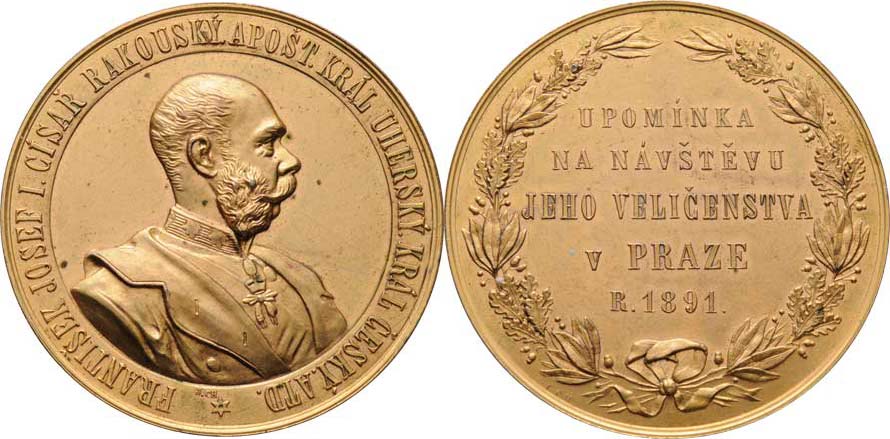 Christlbauer - česká medaile na návštěvu Prahy 1891 - poprsí zprava, český opis / český 5-řádkový nápis ve věnci, Sign., zlacený bronz 54 mm, Haus.714, skvrnky
