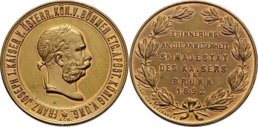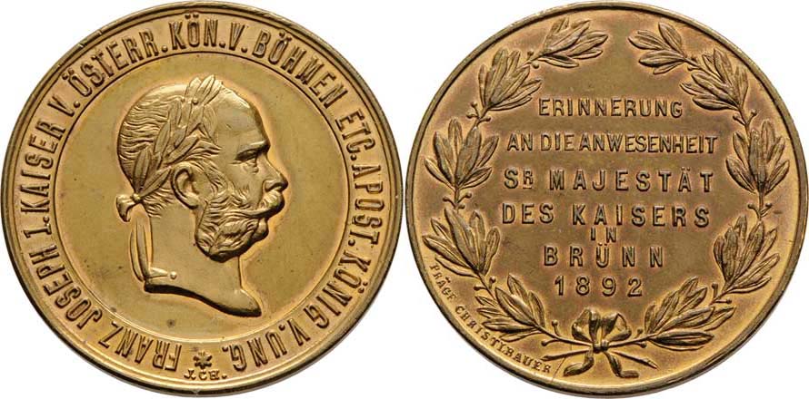 Christlbauer - návštěva v Brně 1892 - poprsí zprava, německý opis / 7-řádkový něm.nápis ve věnci, Sign., zlac.bronz 28 mm, nep.hr., pěkná patina, téměř