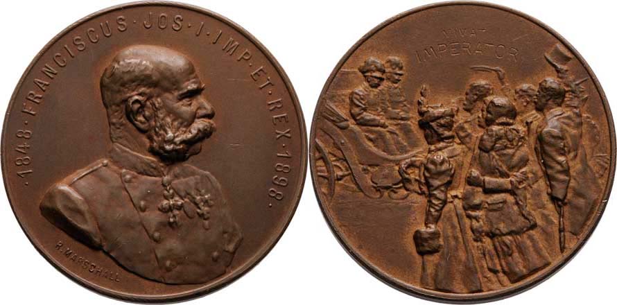 Marschall - AE medailka na 50 let vlády 1898 - poprsí zprava, opis / lid zdraví císaře v kočáře, nápis, Sign., bronz 29 mm, 13.879g, pěkná patina