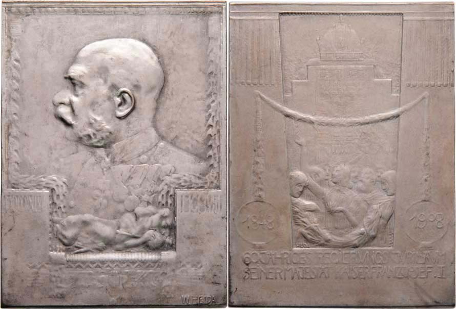 Hejda - plaketa na 60 let vlády 1908 - poprsí zleva, vročení / koruna, skupina osob, vavříny, vročení a nápis, Sign., pat. postř. bronz 57x80 mm, pův.etue
