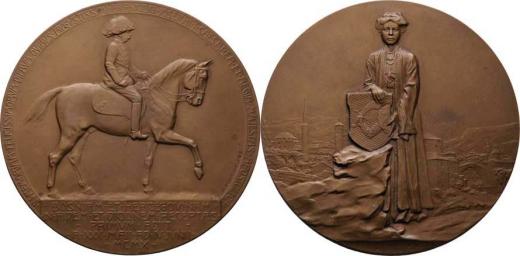 Placht - medaile na anexi Bosny a Hercegoviny 1910 - císař na koni zprava, opis a nápis / personif. Bosny, v pozadí Mostar, Sign., bronz 75mm, 161.290g, patina