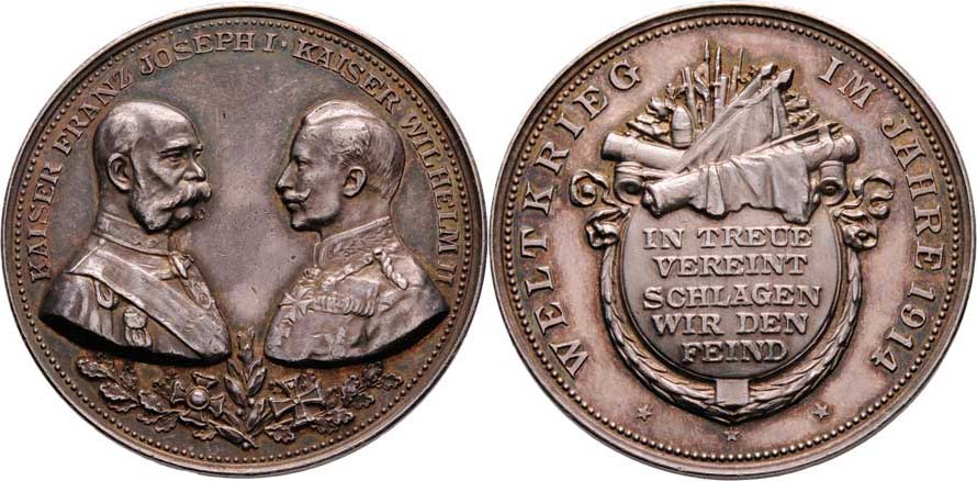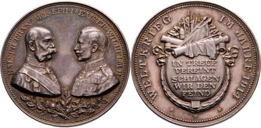 Oertel - medaile na světovou válku 1914 - portréty Fr.Josefa a Viléma II., opis / zbraně, nápis ve věnci a opis, Sign., Punc., Ag990, 35mm, 16.842g, patina
