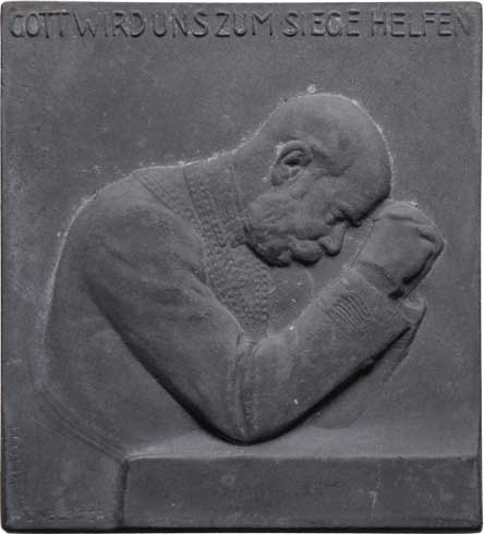 Scolik a Weinberger - císař při motlitbě b.l. (1914) - císař se sepjatýma rukama, německý nápis, Sign., zinek 61x70 mm, 102.186g, patina R!