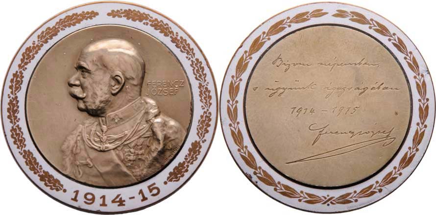 Sign.RN - medaile na světovou válku 1914/1915 - poprsí zleva, maďar.nápis / faksimile rukopisu, bronz 50mm v bíle smalt.mezikruží 65mm, 110.357g, rys.,etue
