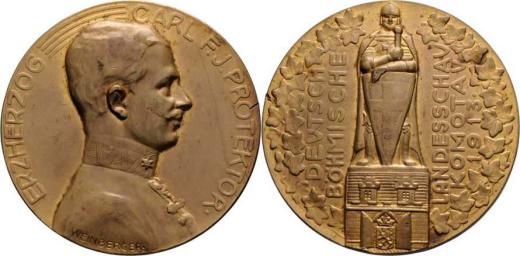 Weinberger - Německá zemská výstava v Chomutově 1913 - poprsí budoucího císaře zprava, opis / znak, rytíř a nápis ve věnci, Sign., bronz 60 mm, dr.vryp, rysky