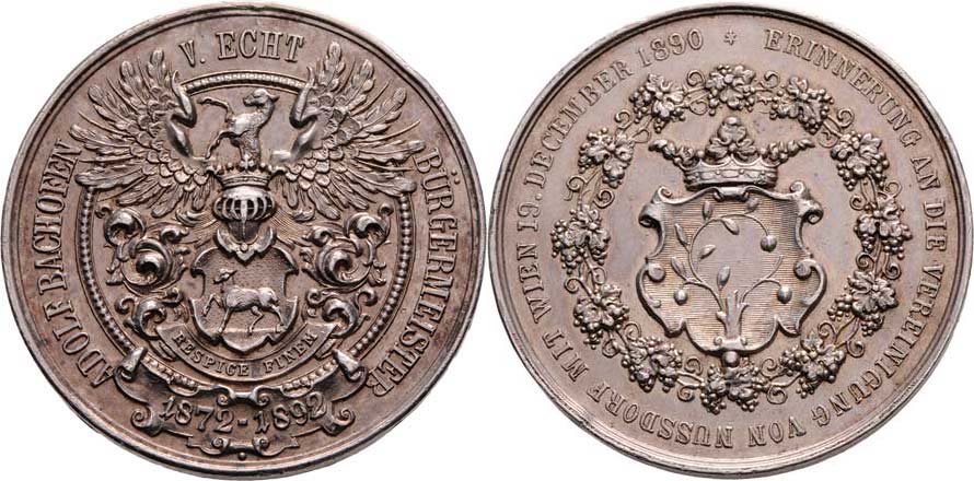 20 let v úřadu purkmistra v Nusdorfu u Vídně 1892 - rodový znak, vročení v kartuši a opis / znak města, věnec a opis, Sign.JC, Punc., Ag 35mm, 22.042g, pat.