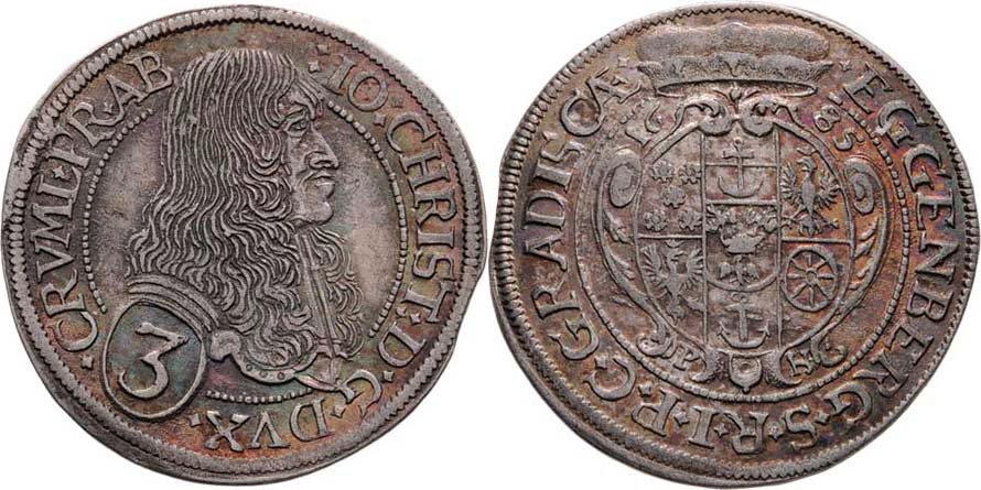 3 Krejcar 1685 PH, Český Krumlov-Häckhl, Don.neuvádí, BPM.2 (str.41), PR.45, 1.767g, nep.okr., pěkná patina, téměř RR!