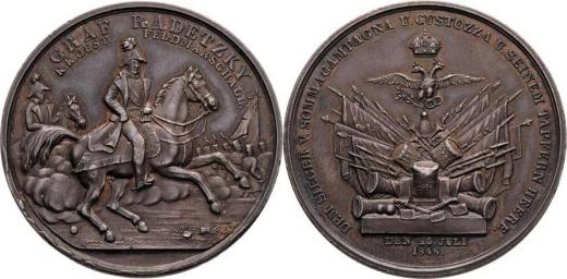 Nesign. - medaile na vítězství u Custozy 25.7.1848 - maršál na koni, v pozadí vojsko / trofeje, císařský orel, opis, Ag 40mm, 24.515g, BPM.332, H.7557(Sn) R!