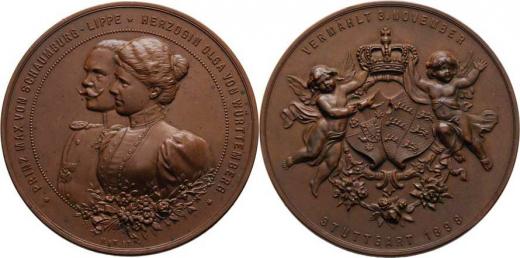 Sign. M.W.ST. - zásnubní medaile 3.XI.1898 - dvojportrét zleva, opis/ 2 putti drží znaky a korunu, opis, 54mm, 68.314g, nep.rysky, skvrnky, patina R!