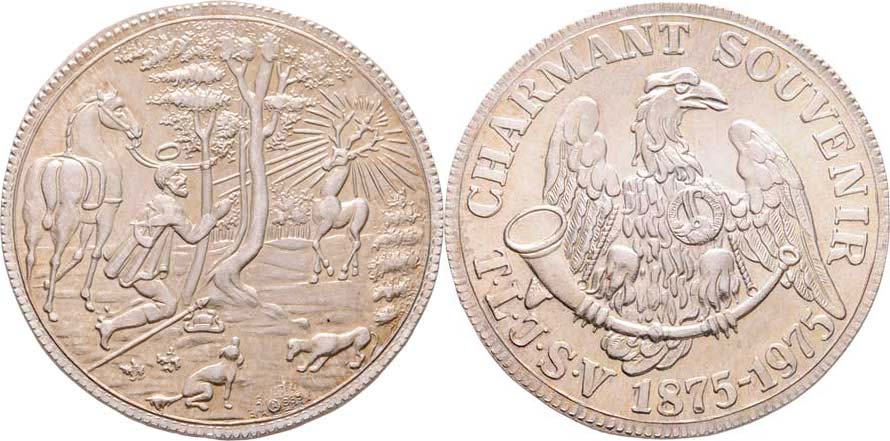 Stříbrná lovecká medaile 1875/1975 - vidění svatého Huberta / orel sedící na lovecké trubce, opis, Nesign., Punc., Ag835, 28mm, 6.423g