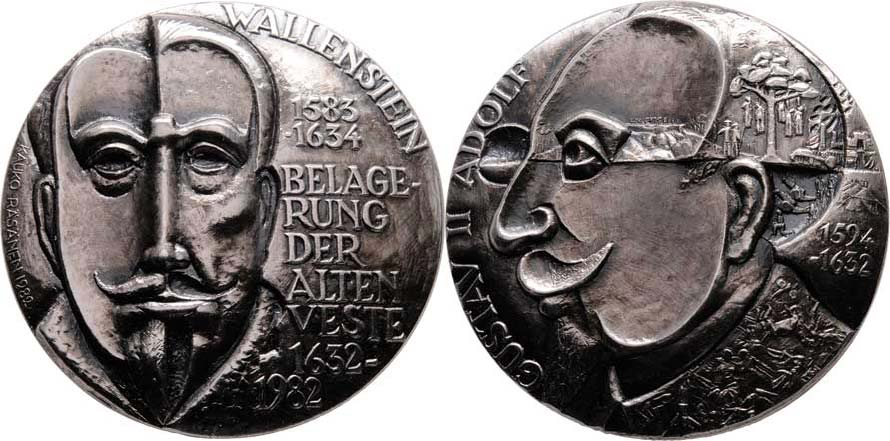Kauko Räsänen - AR pamětní medaile 1632/1982 - portrét Albrechta Valdštejna, písmo / portrét Gustava Adolfa, písmo, Sign. patin. Ag1000, 40mm, 70.548g R!