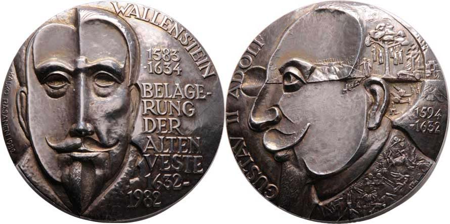 Kauko Räsänen - postř. pamětní medaile 1632/1982 - portrét Albrechta Valdštejna, písmo / portrét Gustava Adolfa, písmo, Sign. postř.bronz 70mm, 361g, etue R!