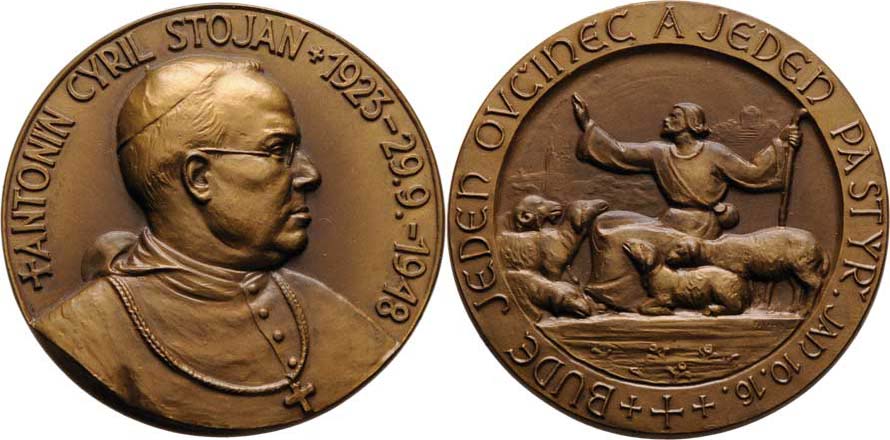 Pelikán - medaile na 25.výročí úmrtní 1948 - poprsí zprava, opis / Kristus jako pastýř, opis, Sign., patinovaný bronz 50mm, 48.845g, Taul.379