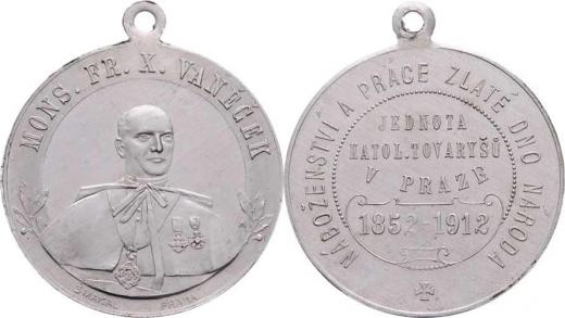 Jednota katolických tovaryšů 1852/1912 - Mons. F.X. Vaněček, Sign. Šmakal, hliník 33 mm s raženým ouškem, jako Přib.752 (hliník neuvádí), dr.hr., dr.rys., pat.
