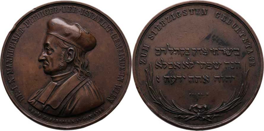I.N.Mannheimer - vídeňský rabín - 70.narozeniny 1863 - poprsí zleva, opis / 3-řádkový hebrejský nápis ve věnci, něm.opis, Nesign., měď 50 mm, hrany, rysky RR!