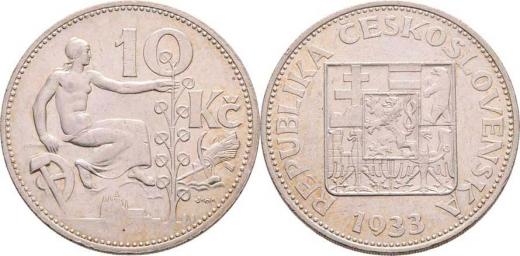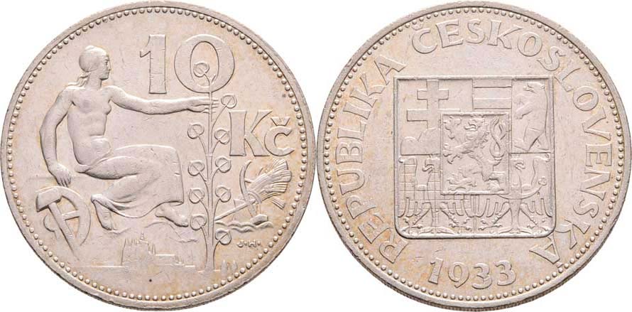 10 Koruna 1933 (Ag700), 9.941g, nep.hr., nep.rysky, pěkná patina RR!