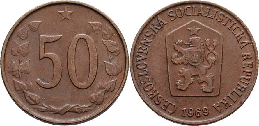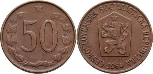 50 Haléř 1969 - bez teček po stranách letopočtu - původní ražba, 3.045g, dr.hr., dr.rysky, patina R!