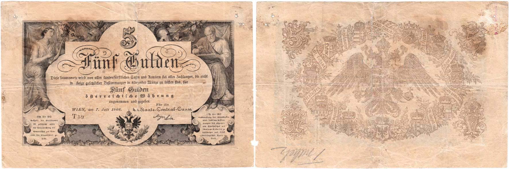 5 Gulden 1866, Ri.139a, Pick.A151a - sér. T89 RR!