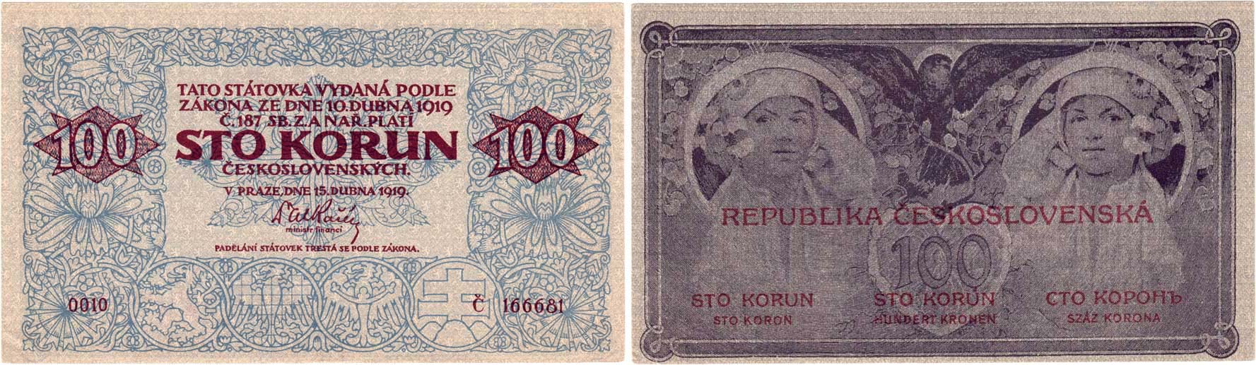 100 Koruna 1919, série 0010, BHK.12 - dobové falzum - bez vodotisku - dle evidence ČNB padělek typu 7