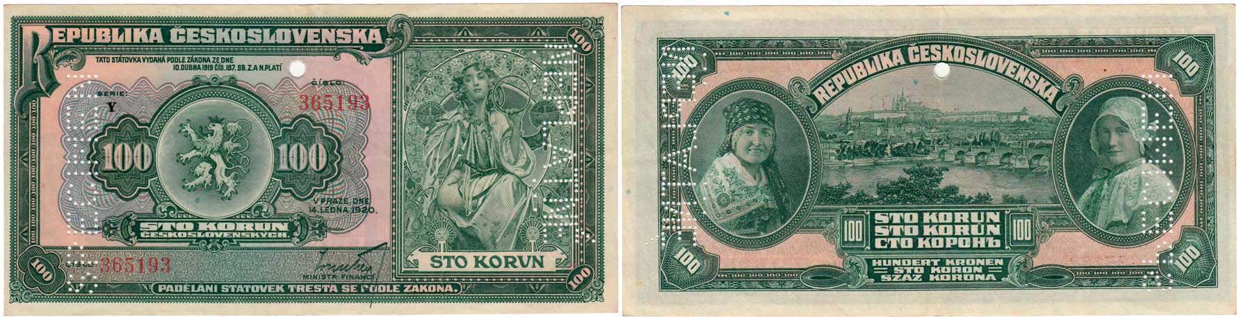 100 Koruna 1920, série Y - perforace 1x "NEPLATNÉ", 1x "SPECIMEN", 1x otvor 3.5 mm R!