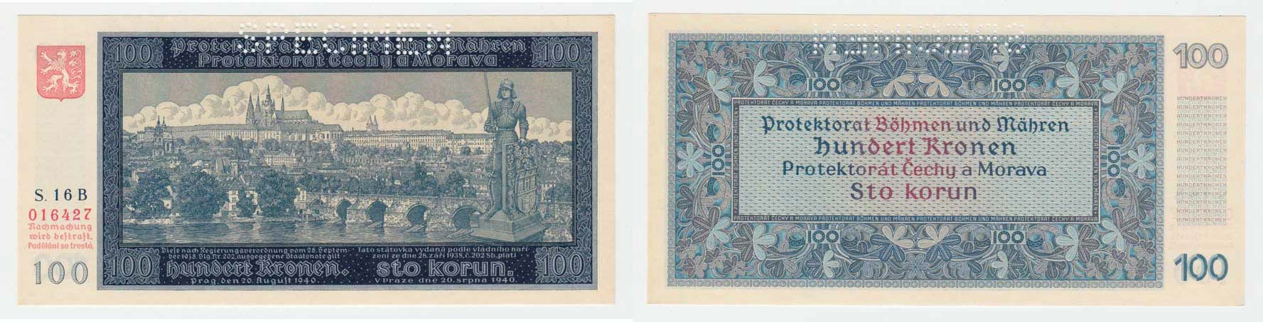 100 Koruna 1940 - 1.vyd., sér.16B, BHK.32 "SPECIMEN"